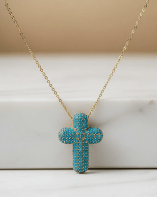 Crystal Blue Cross Charm in Gold Chain Necklace-W