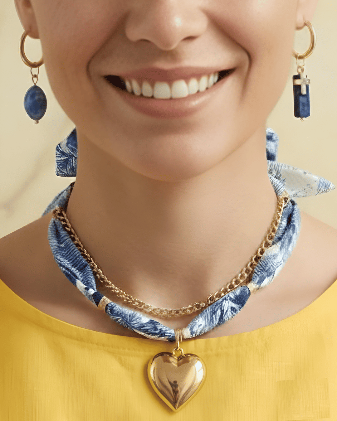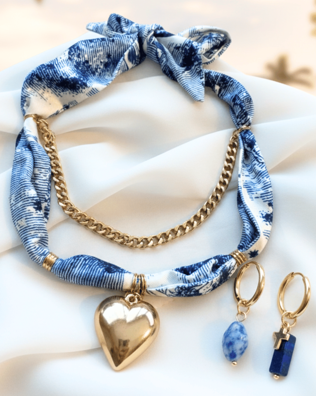 Elegant Spring and easter product Blue and white pattern Scarf, Gold Chain Heart Necklace With Earring Set, featuring a soft silk scarf in a blue and white artistic print, with an adjustable 18K gold plated chain and a stylish Golden Heart Charm. The goldplate is non tarnish and durable. The necklace’s bow at the back, details brings a chic, feminine touch, making it perfect for both everyday wear and special occasions. The set includes hypoallergenic gold hoop earrings adorned with natural lapis lazuli stone drops in the shapes of oval and rectangle, featuring blue white patterns and a gold cross charm on the rectangular earring known for their calming and empowering properties. Their minimalist gold hardware adds a luxurious finish, creating a harmonious blend of style and spirituality. Handmade & Handpacked in USA by an all women oriented business. Product cards may vary.
