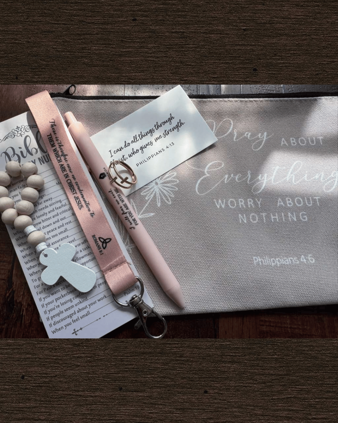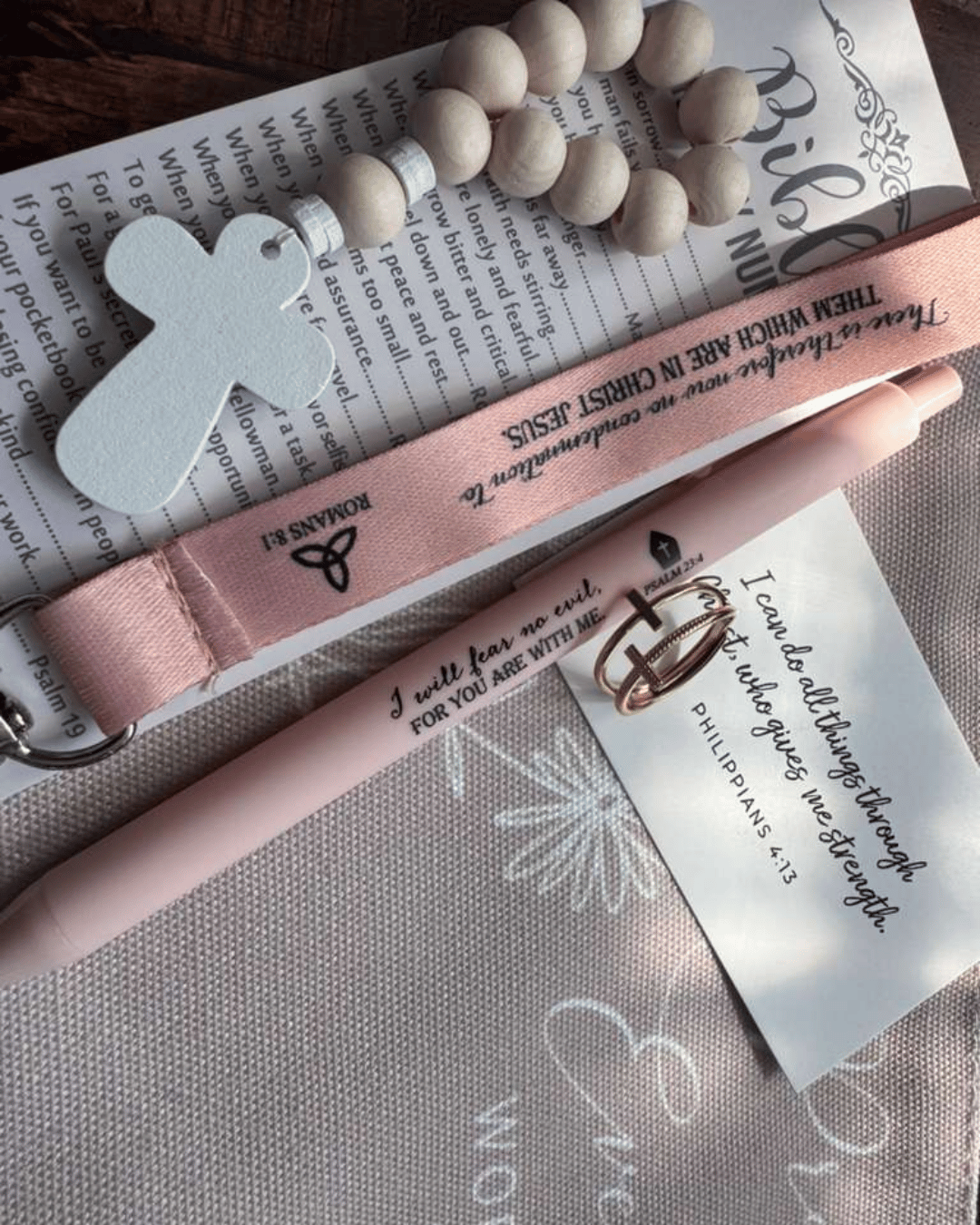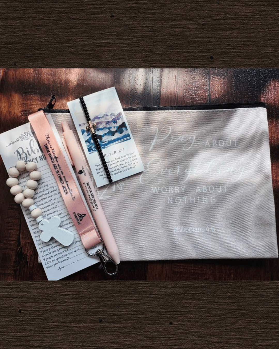 Bag + Bible quote Pen+ rings or cross bracelets on scripture card +key fob + bookmark+ holding cross + a surprise gift from our side. Set of 7 products along with a card and a SURPRISE GIFT included!