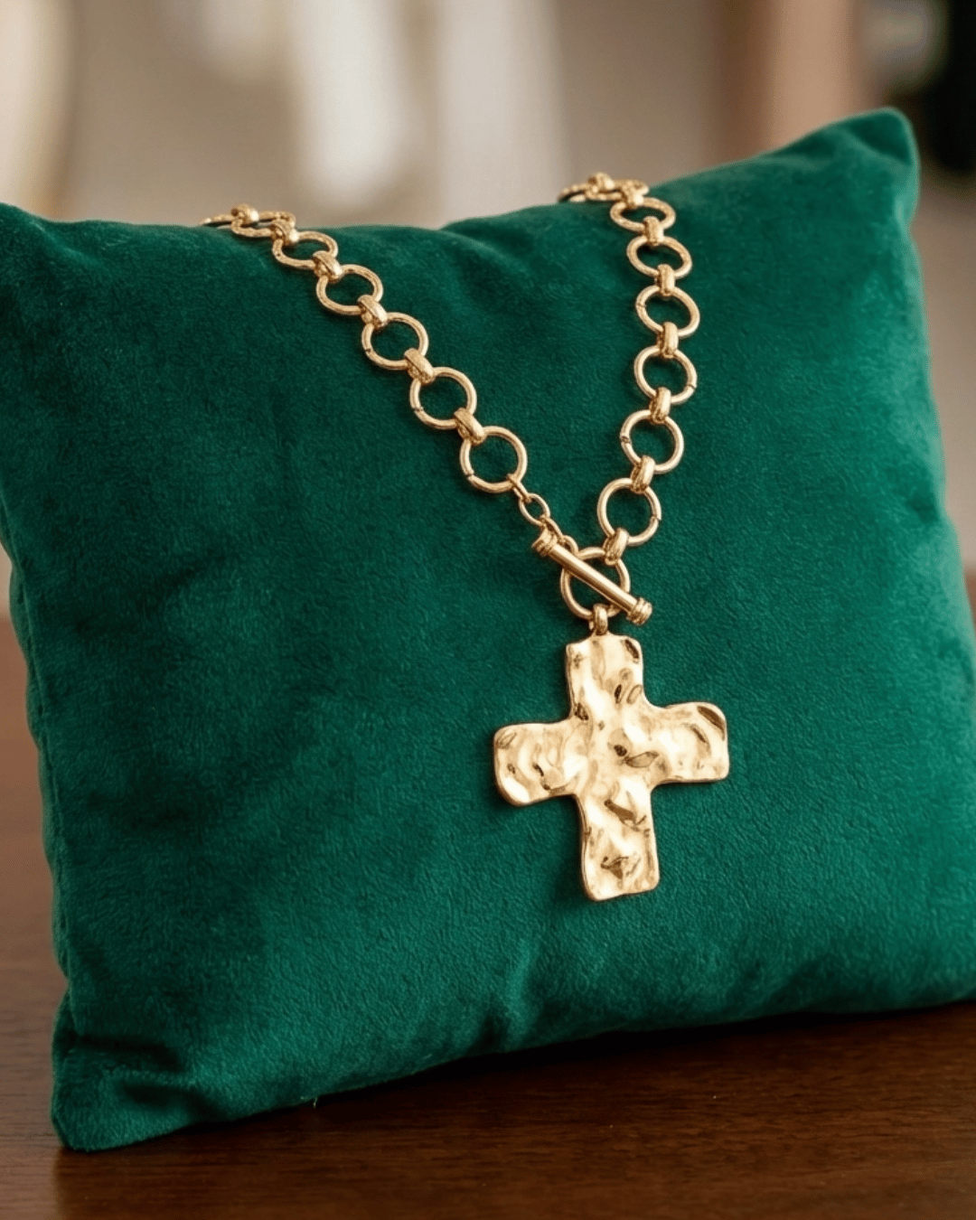 Make a bold statement with this Golden Hammered Cross Chunky Chain Necklace, crafted to stand out with modern elegance. The textured hammered cross adds artisanal depth, while the chunky gold tone chain delivers a strong, fashion forward appeal. Designed for durability and comfort, it’s perfect for everyday wear or standout styling. Ideal for layering or wearing solo, this necklace enhances any outfit with timeless cross jewelry charm and contemporary edge.