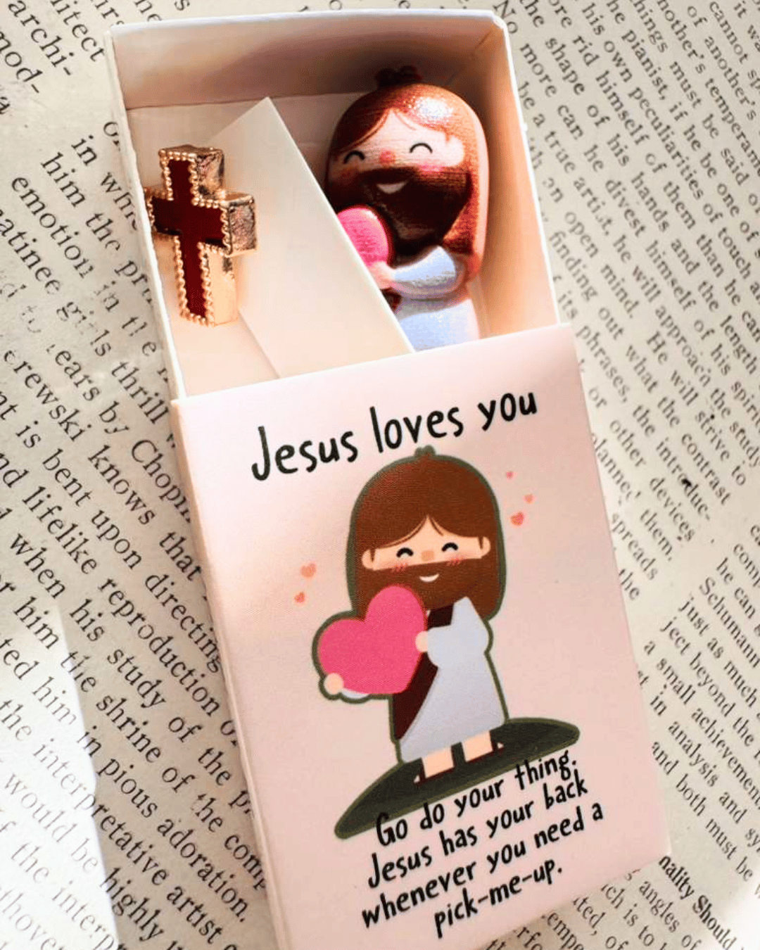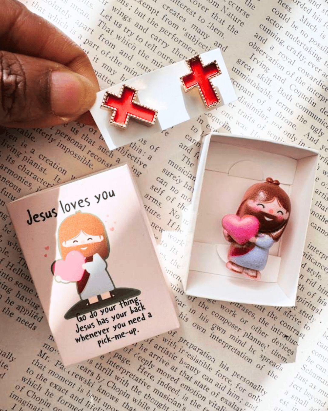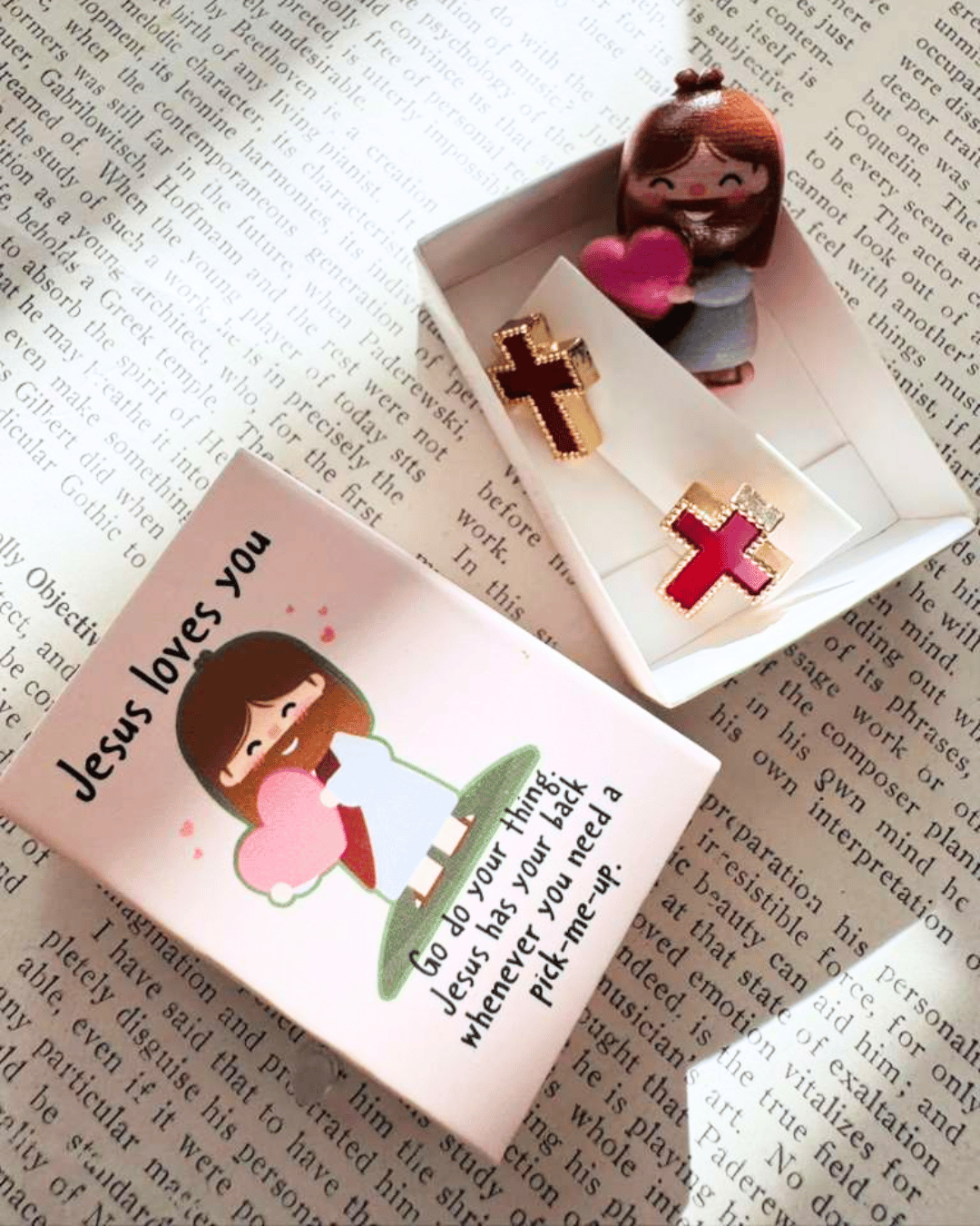 The cutest little Jesus with a heart, paired with sweet red cross earrings and a meaningful message printed on both sides of a matchbox-style box. Red Cross Studs With Jesus features a beautiful Red Cross stud which has golden border and a vibrant red enamel in the middle. It comes with a wooden Little Jesus holding a pink heart model. The entire things are placed inside a matchbox style box. Bigger in size with cute message printed on both sides of the box. The box also contains a cute illustration on the front. Each set includes Little Jesus + box + earrings.