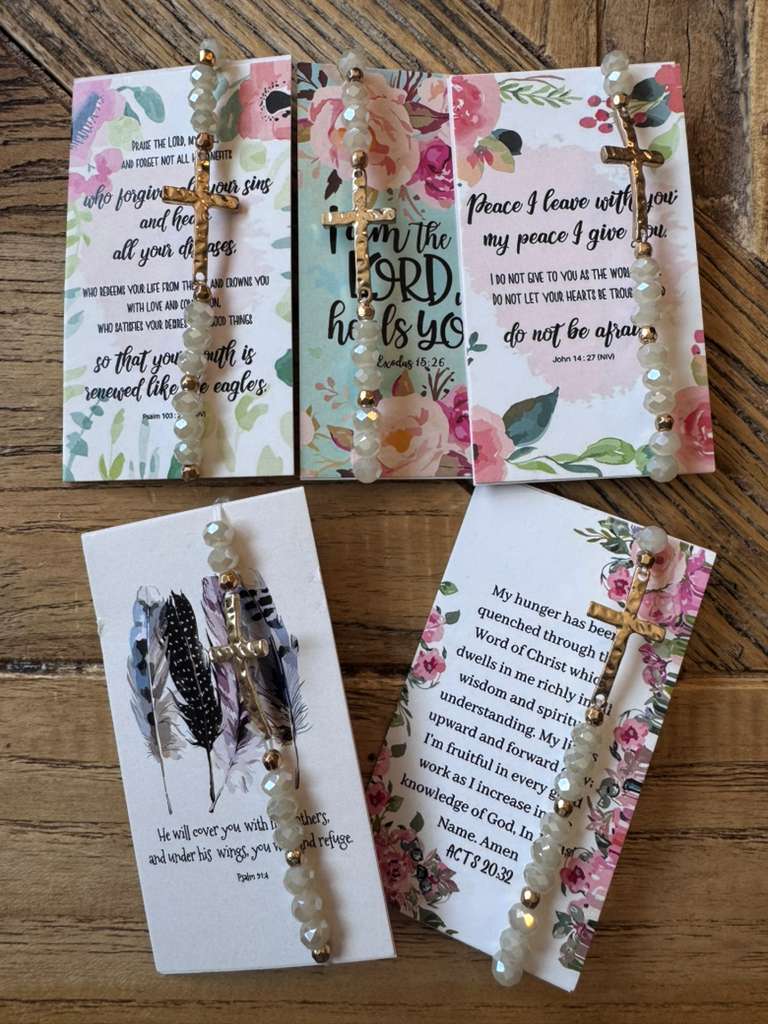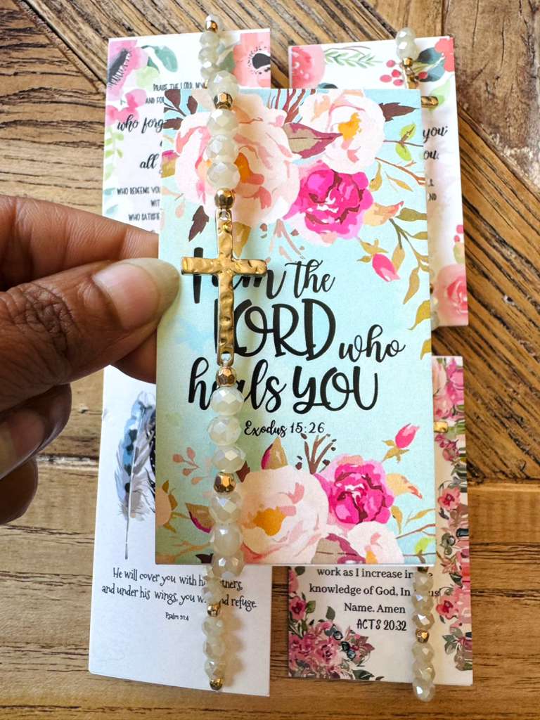 This Beige Hammered Cross Beaded Bracelet is more than just jewelry; it’s a symbol of faith, hope, and love. The rich off-white beads reflect the joy of the season, while the hammered gold cross serves as a gentle reminder of God’s everlasting presence. It is handcrafted with faceted green crystal beads, golden hammered detailing with cross charm centerpiece. It also includes a scripture prayer card with uplifting verses, making it perfect for Christmas, religious celebrations, or personal devotion. Whether worn daily or kept as a keepsake, it offers encouragement, strength, and a reminder of God’s promises.