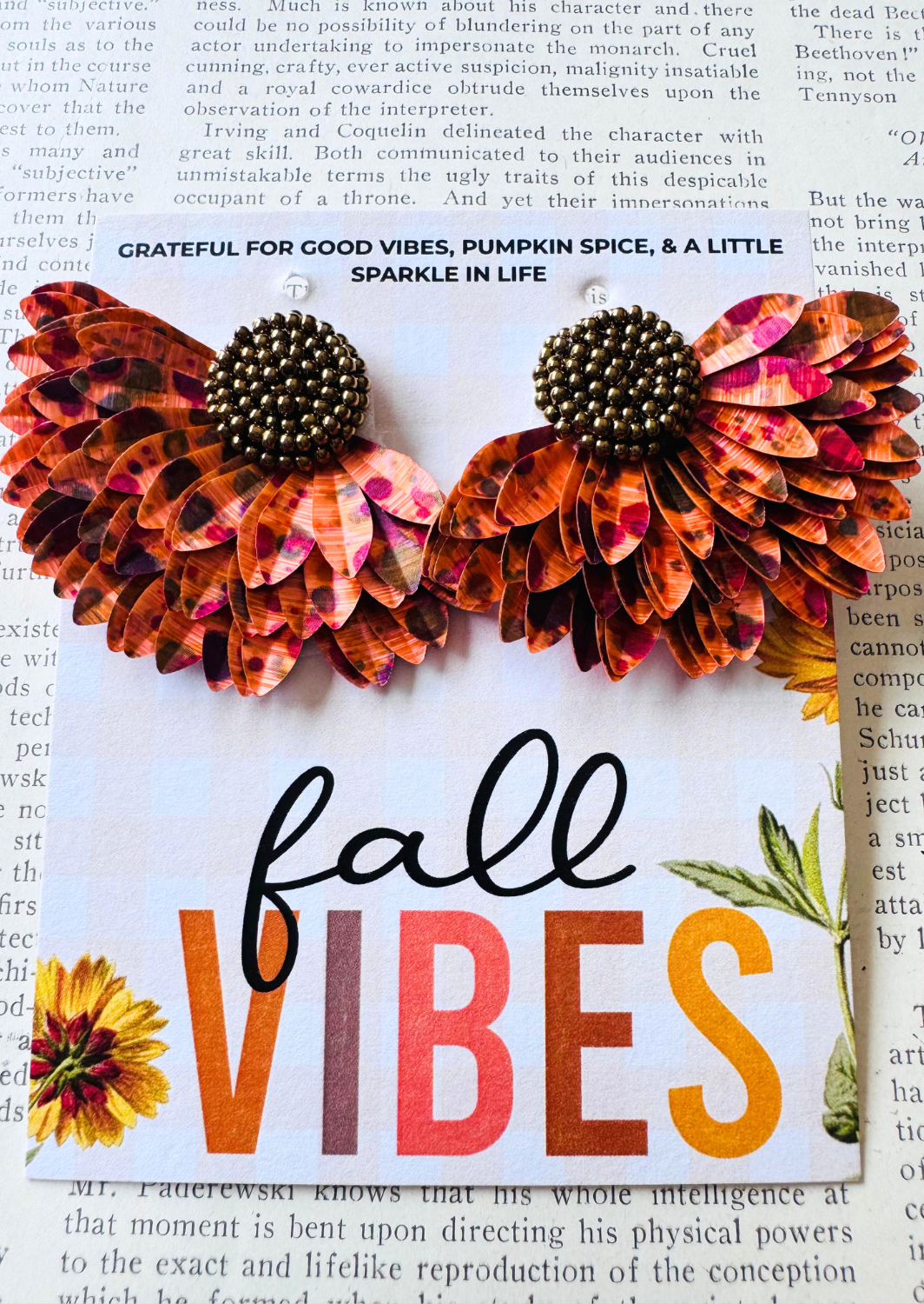 Step into the season with our Fall Color Half Flower Earrings, designed to bring the warm hues of fall to your look. Featuring layered floral petals in rich orange, green, hot pink and berry tones with a bold golden beaded center; these earrings capture the essence of cozy autumn days and festive fall nights. Lightweight yet eye-catching, they’re perfect for adding seasonal charm to any outfit - from pumpkin patch outings to holiday gatherings. Presented on our customized fall cards by Swaary's team.