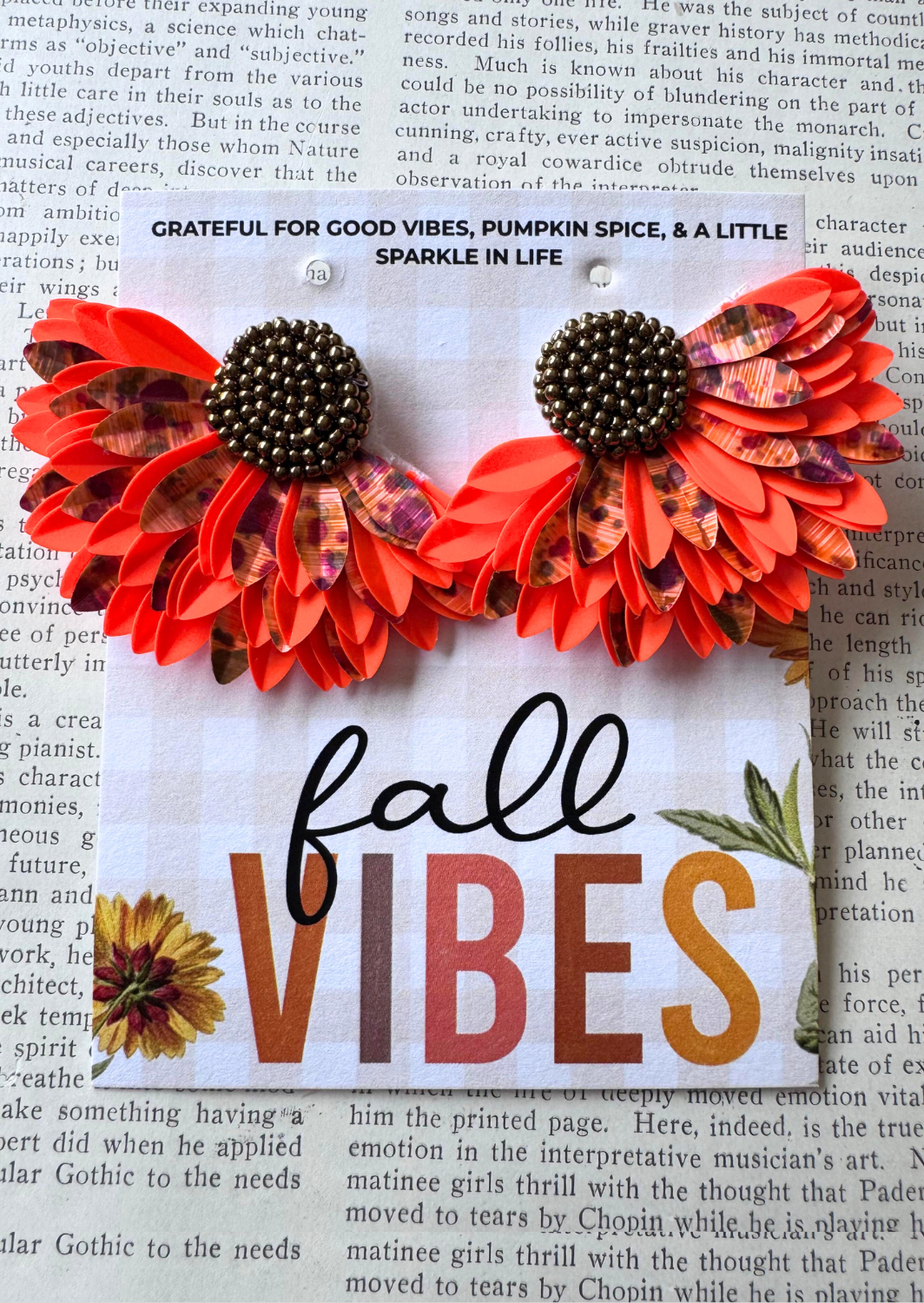 Bring the warmth of fall to your style with our Fall Half Flower Earrings. Featuring vibrant layered petals in fiery orange with touches of patterned detail, these earrings are beautifully finished with a textured golden bead center. Perfect for adding a bold, seasonal touch to your outfits, they capture the cozy essence of pumpkin spice, crisp leaves, and everything fall. Lightweight yet eye-catching, they’re made to complement both casual and dressy looks. Presented on our beautiful customized fall cards which are created by Swaary's team.