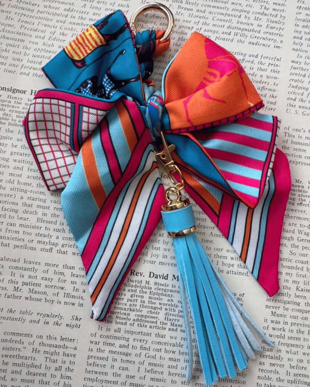 This bright western print stripy satin bow keychain with blue tassel charm showcases bold patterns and vibrant colors for a trendy boutique accessory. Crafted with smooth satin fabric, a braided accent loop, and a stylish faux leather tassel, it adds a fun statement to any look. The secure clasp makes it perfect for attaching to keys, handbags, backpacks, or zipper pulls. Ideal for western fashion lovers, gift giving, and adding a colorful pop to everyday accessories.