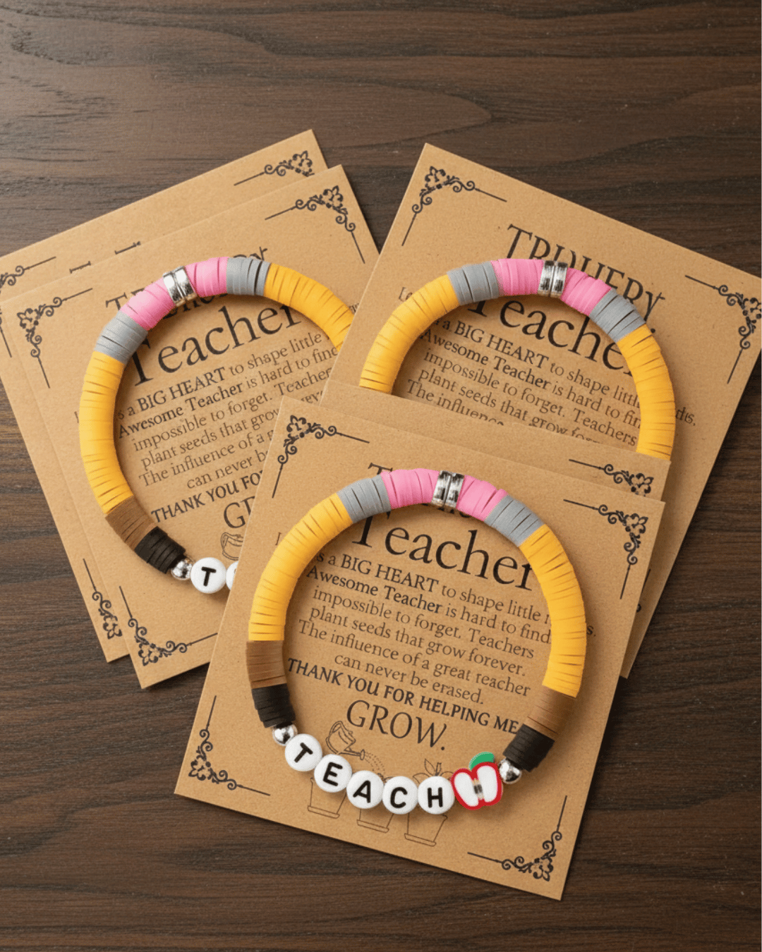 Show heartfelt gratitude with this teacher appreciation bracelet set featuring the letters "TEACH" and colorful apple with vibrant bead designs. Made using high quality non tarnish, acrylic beads. Each bracelet comes with a thoughtful greeting card, perfect for Teacher’s Day, graduation, or back to school gifts. Made with durable elastic and vibrant beads, It is stretchy and adjustabl4e, these bracelets fit most wrists comfortably for daily wear. Ideal bulk gift set for students, schools, and classrooms to honor teachers with a meaningful keepsake. Product Cards may vary. Made in USA.
