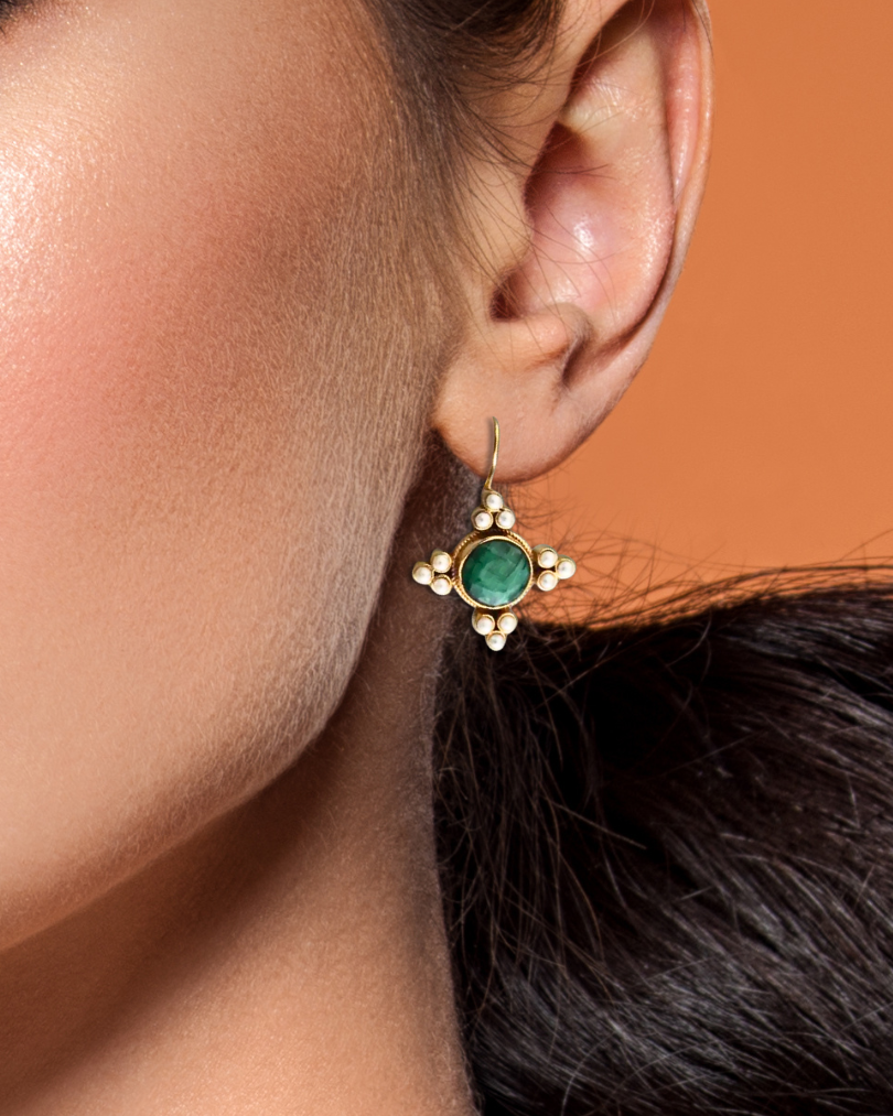 Elevate your look with the Bohemian Crystal & Pearl Dangle Earrings — a stunning fusion of bohemian charm and refined sophistication. Featuring radiant green synthetic zircon crystals paired with lustrous faux pearls, these gold-tone earrings are designed to dazzle. Lightweight and comfortable with an elegant drop silhouette, they’re perfect for parties, romantic evenings, and special occasions. Whether you're dressing up for Valentine’s Day or adding a statement piece to your collection, these earrings bring effortless grace and glamour to every moment.