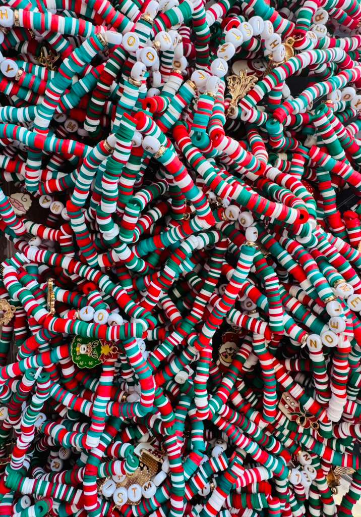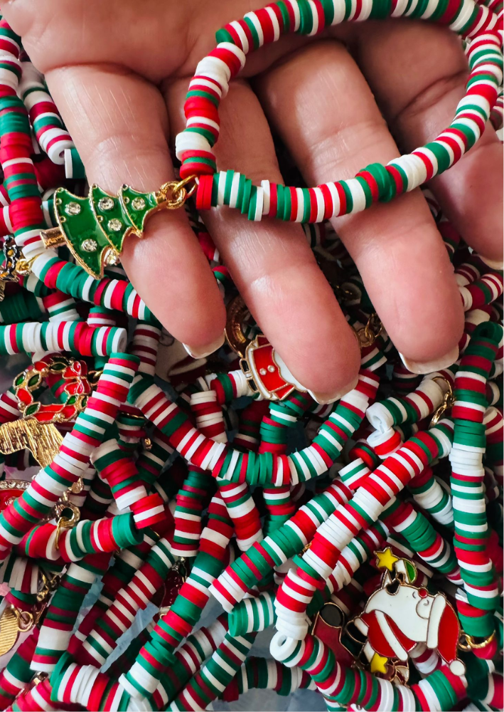 Celebrate the festive season with these vibrant Christmas-themed stretchable bracelets! Featuring red, white, and green beads, each bracelet is adorned with a mix of charming holiday charms and letter beads. Stretchable to fit all wrist sizes comfortably, these bracelets are perfect for gifting or adding a playful holiday touch to your own accessory collection. Made with high-quality materials for lasting wear.