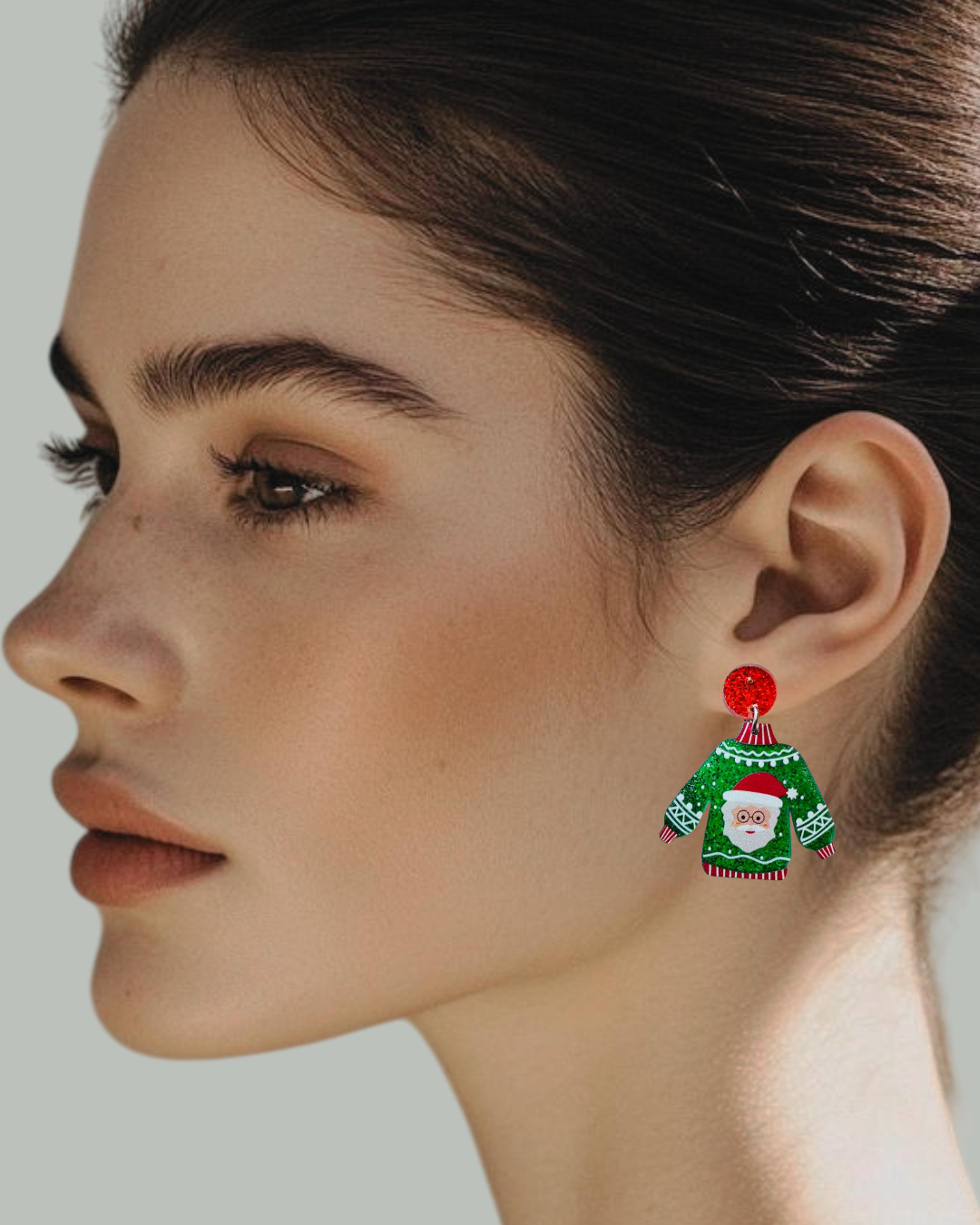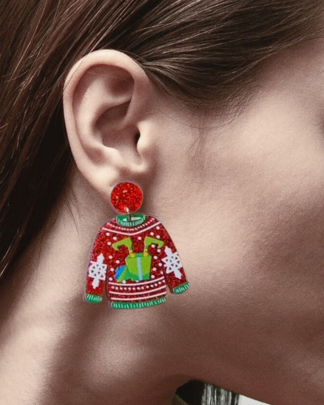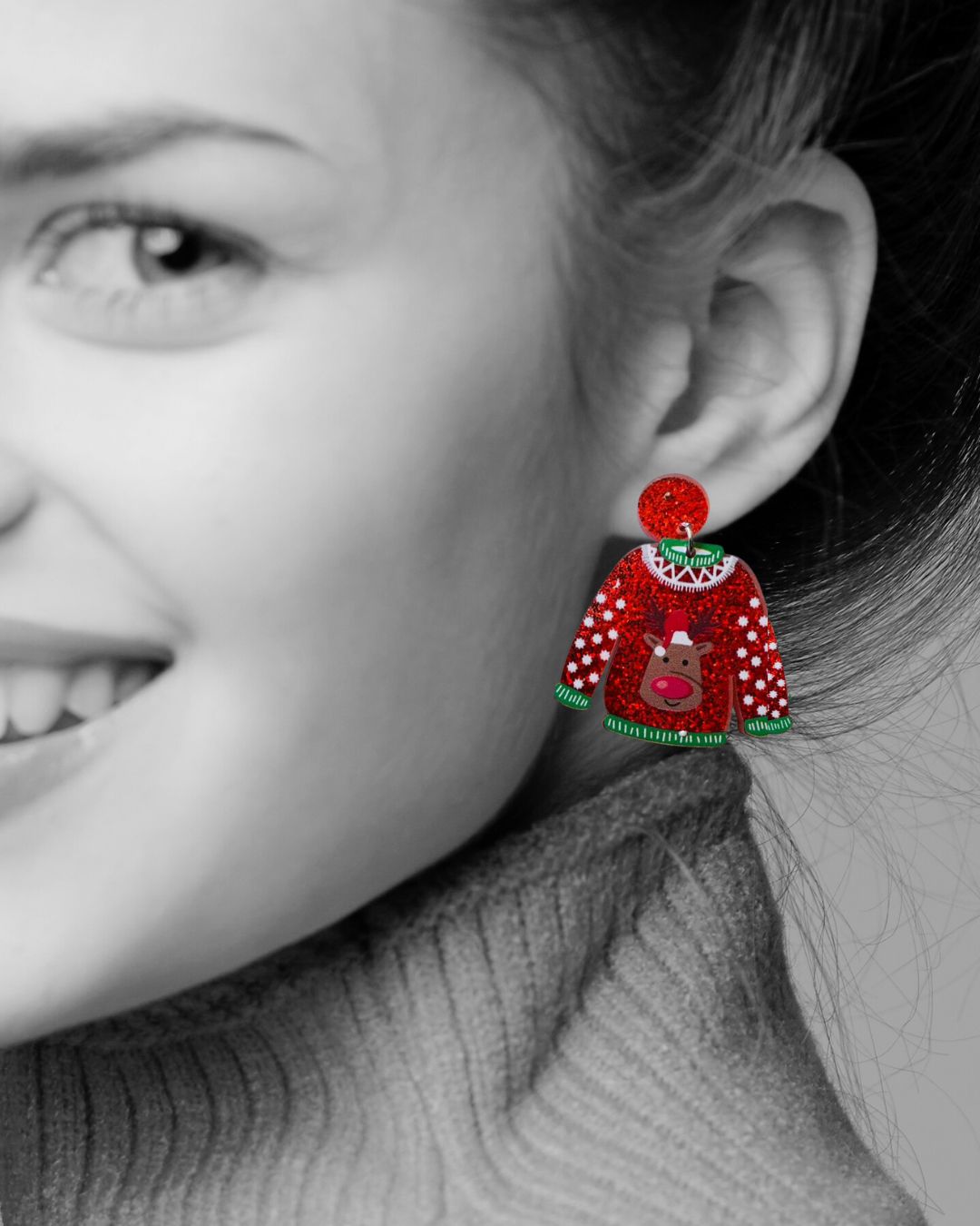 Add playful holiday cheer with Ugly Sweater Dangle Earring. These glitter accented sweater earrings in festive red and green! Featuring cozy Christmas designs like reindeer, gifts, and Santa, they’re lightweight, comfy, and perfect for parties, stocking stuffers, or spreading Christmas joy all season long.