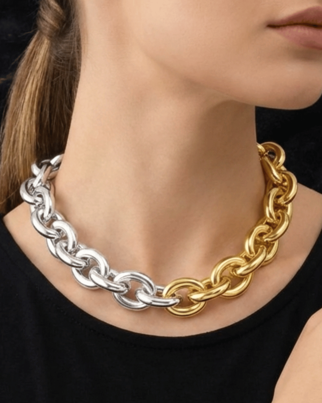 A stylish silver and gold dual-tone thick chain necklace, perfect for a punk hip-hop look. Trendy, bold, and easy to wear, ideal for making a statement!