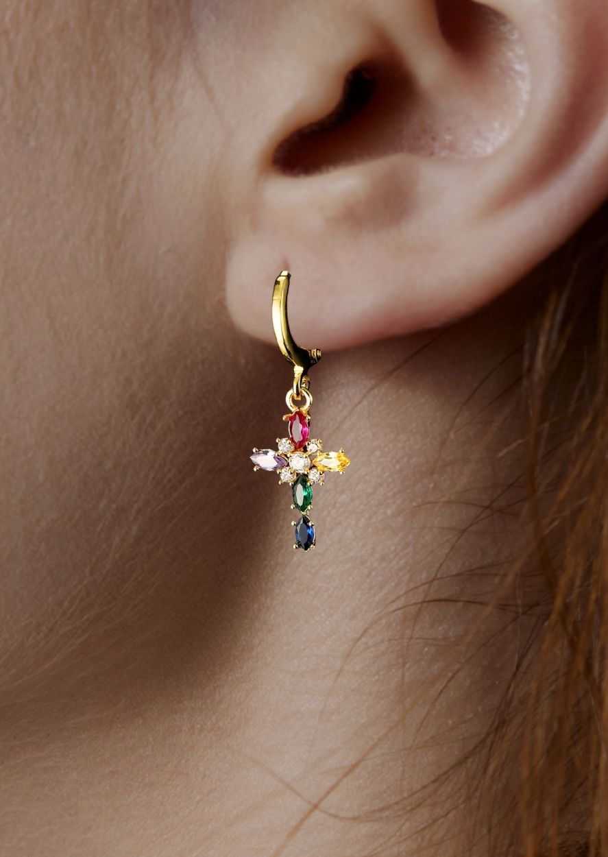 Elevate your style with these vintage boho Rhinestone Cross Golden Hoop Earrings. Featuring a multi-colored crystal cross design, 14K gold-plated copper, and synthetic zirconia, they blend faith and fashion effortlessly. Perfect for banquets, gifts, and everyday elegance.