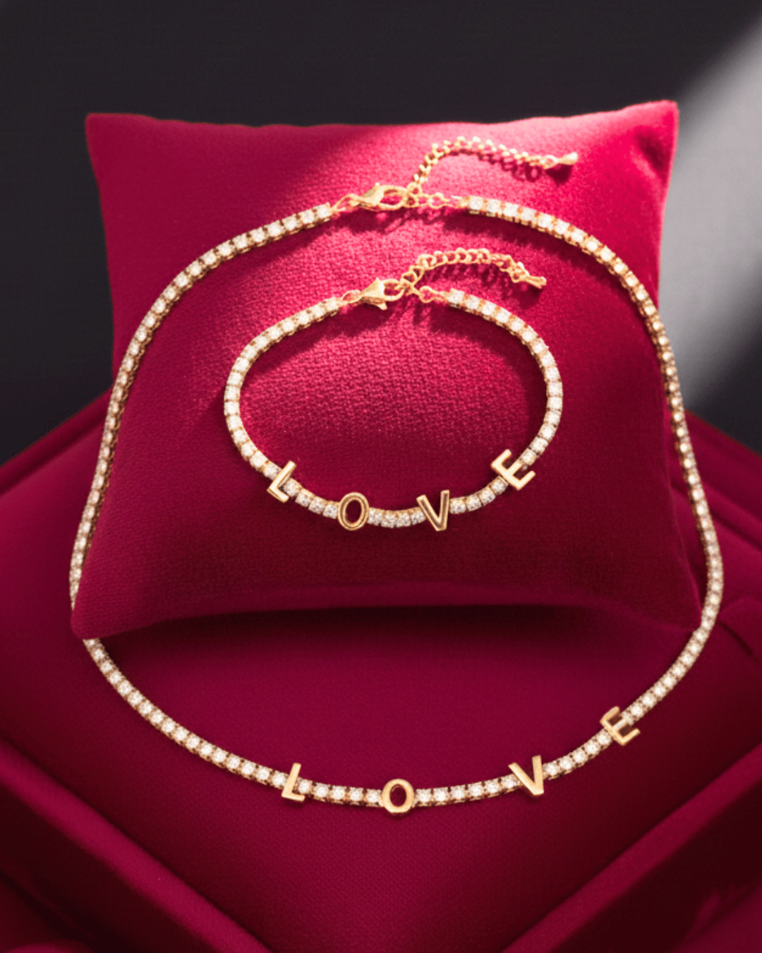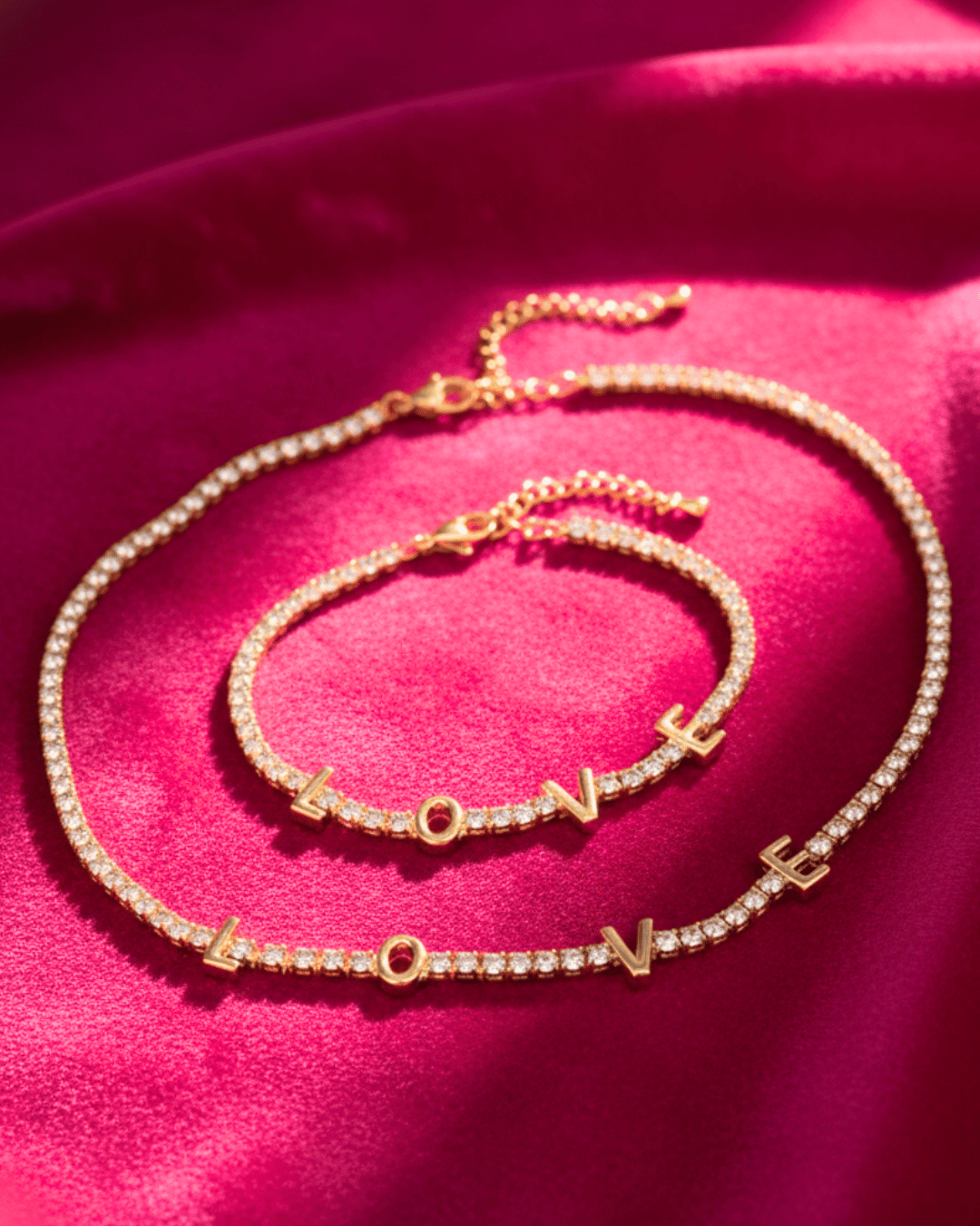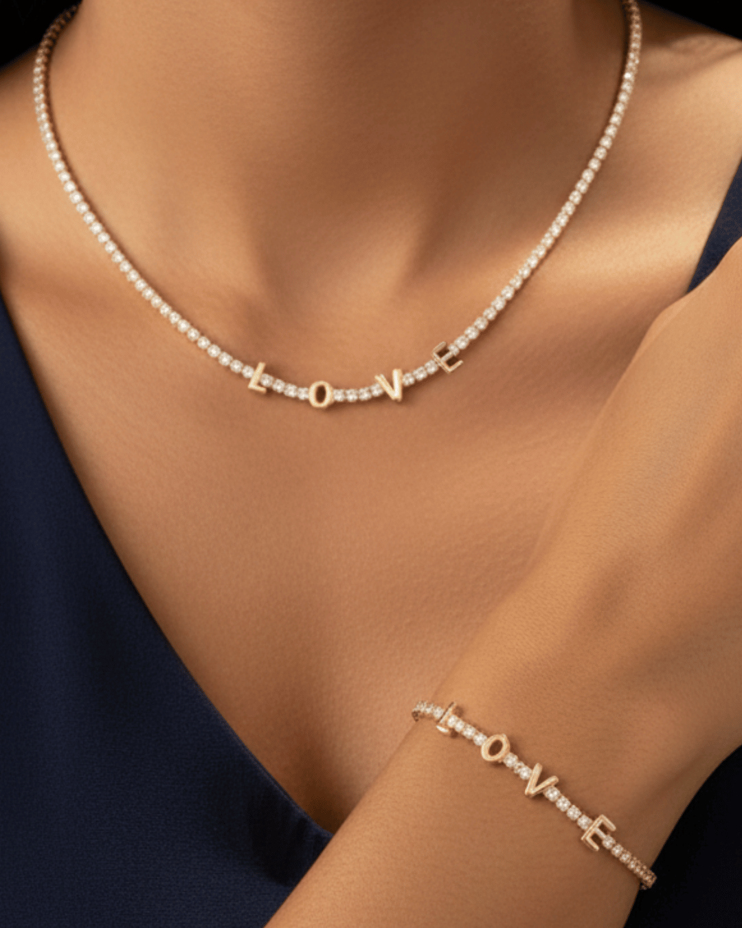 Shine with elegance in this "LOVE" Rhinestone Necklace and Bracelet Set, crafted to sparkle from every angle. Featuring shimmering rhinestone accents and delicate letter charms, it adds a romantic touch to any look. Perfect for Valentine’s Day, anniversaries, date nights, or gifting someone special. Lightweight, comfortable, and designed to complement both casual and dressy outfits. A timeless jewelry set that celebrates love with style and sparkle.