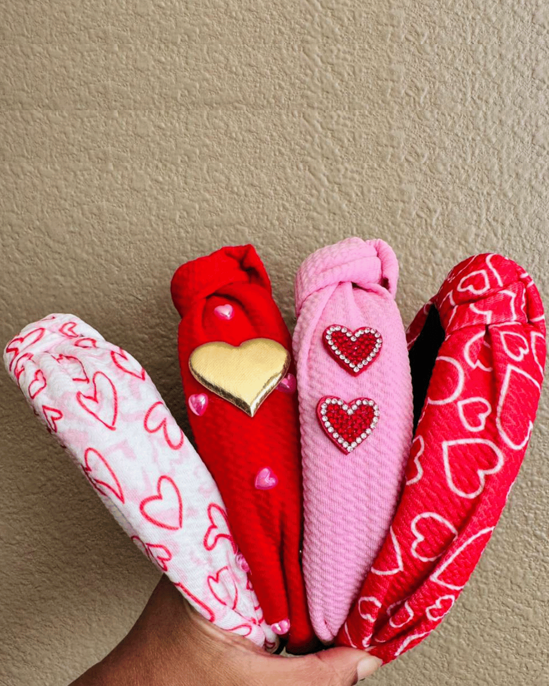Add a touch of love and style with our Valentine's Heart Studded Handmade Headbands (Set of 4), designed to elevate everyday and festive looks. This charming set features Golden heart charmed and beautifully heart printed headbands, carefully handmade for comfort and durability. It is available in 4 different variations, gold heart and pink heart studs on red, white heart border on hot pink, red hearts on white and red sparkly heart studs on light pink. Perfect for Valentine’s Day, parties, photoshoots, or daily wear, these headbands suit kids, teens, and adults alike. Made with soft, skin-friendly & high quality quilted materials, they ensure a secure yet gentle fit all day long.