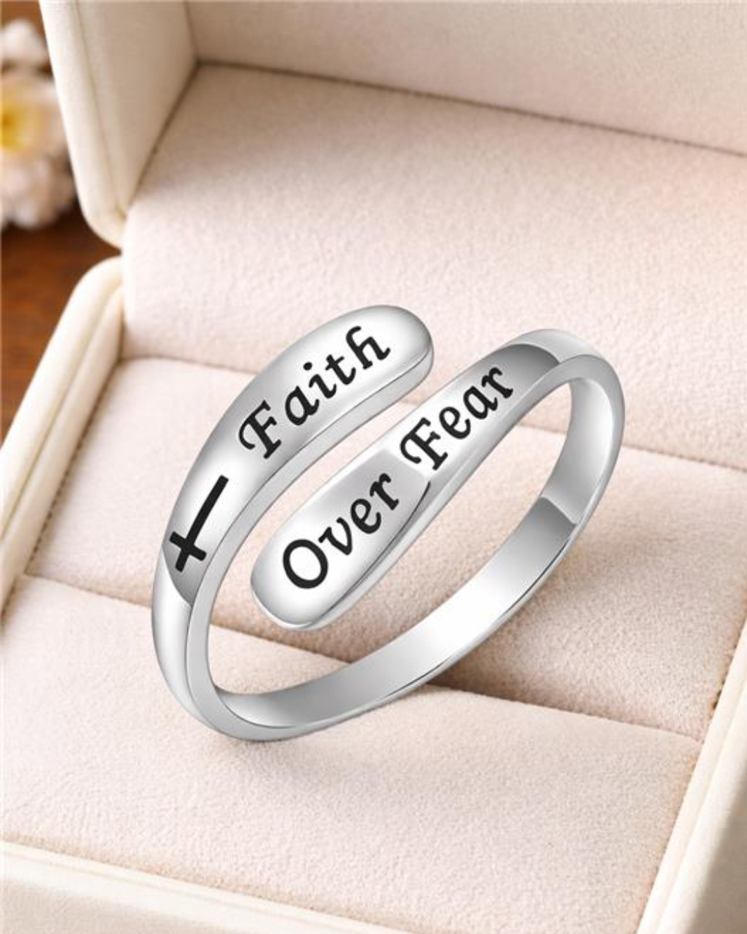 A daily reminder of resilience, the Faith Over Fear Adjustable Ring features a minimalist design with an empowering "Faith Over Fear" engraving. Crafted from durable high quality alloy, this elegant piece is perfect for everyday wear or as a thoughtful gift for loved ones seeking encouragement and inspiration. Adjustable for a comfortable fit, it’s a timeless symbol of strength and belief. RTS. Handpacked in USA by an all women oriented business.