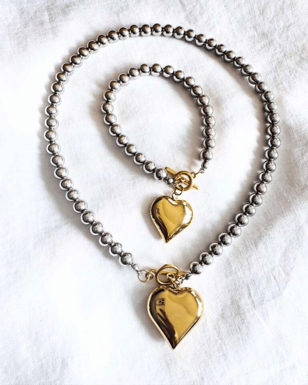 Featuring polished stainless steel silver beads and a radiant 18K gold plated charm, it offers a timeless two tone look. The necklace is 43cm long & the bracelet stands at 20cm. Lightweight, hypoallergenic, and perfect for everyday wear. A versatile piece that layers beautifully or shines on its own. The ideal gift for someone who loves minimalist, modern jewelry. Start the gold and silver trend with these. Made in USA.