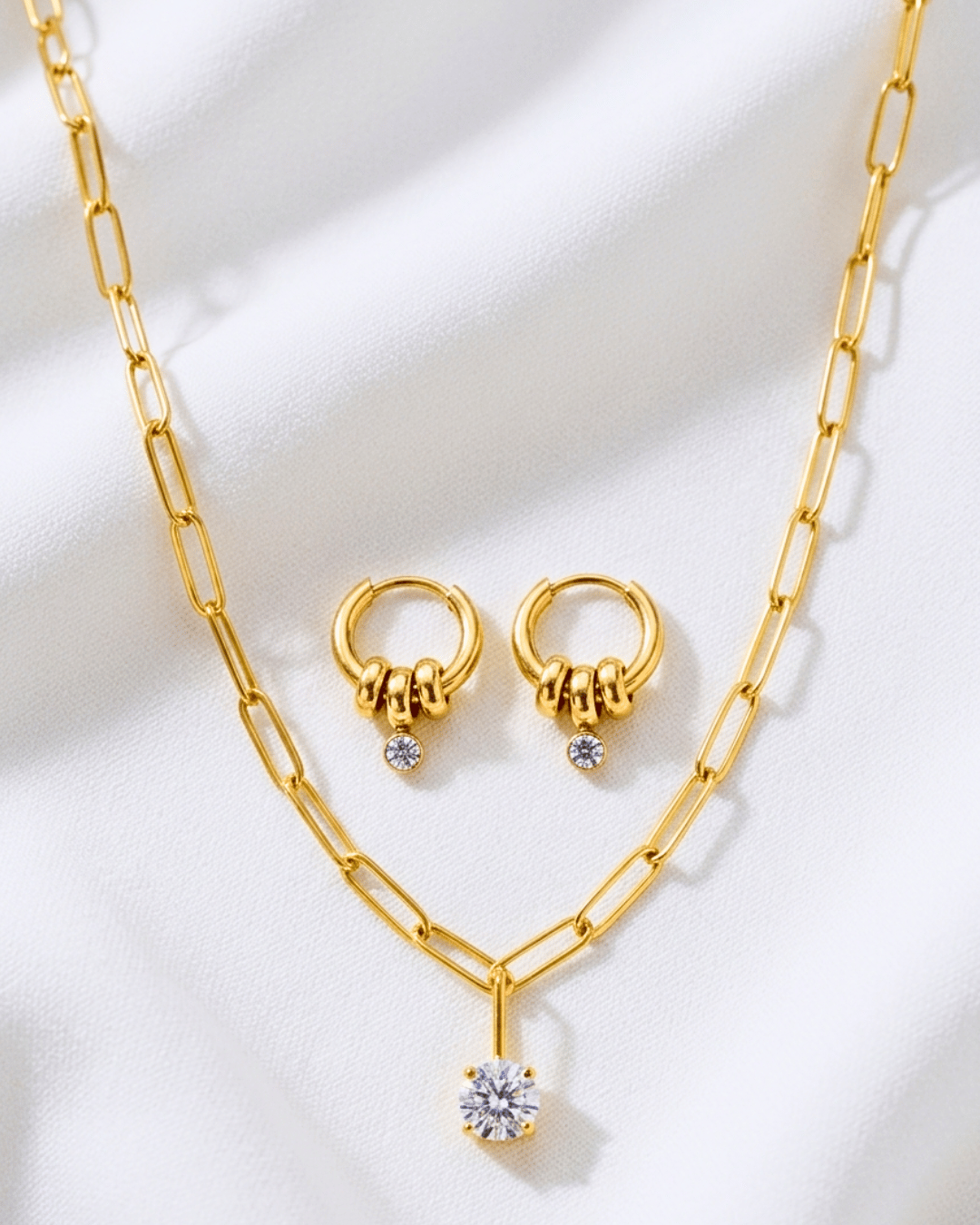 RTS. Zirconia Round Pendant Paperclip Gold Necklace & the Zirconia Drop Charm Gold Hoop Earrings are designed with a sleek geometric touch. Crafted from durable 304 stainless steel and finished with 18K real gold vacuum electroplating (PVD coated in furnace), these pieces offer long-lasting shine and strength. They are non-tarnish, waterproof and hypoallergenic. The square & heart pendants feature sparkling glass and zircon inlays for brilliant, eye catching elegance. Complete with a secure lobster trigger clasp closure, they're perfect for everyday wear or special occasions. Handmade and handpacked in the USA by an all women oriented business. Packed in beautiful organza bags tied with pretty satin bows.