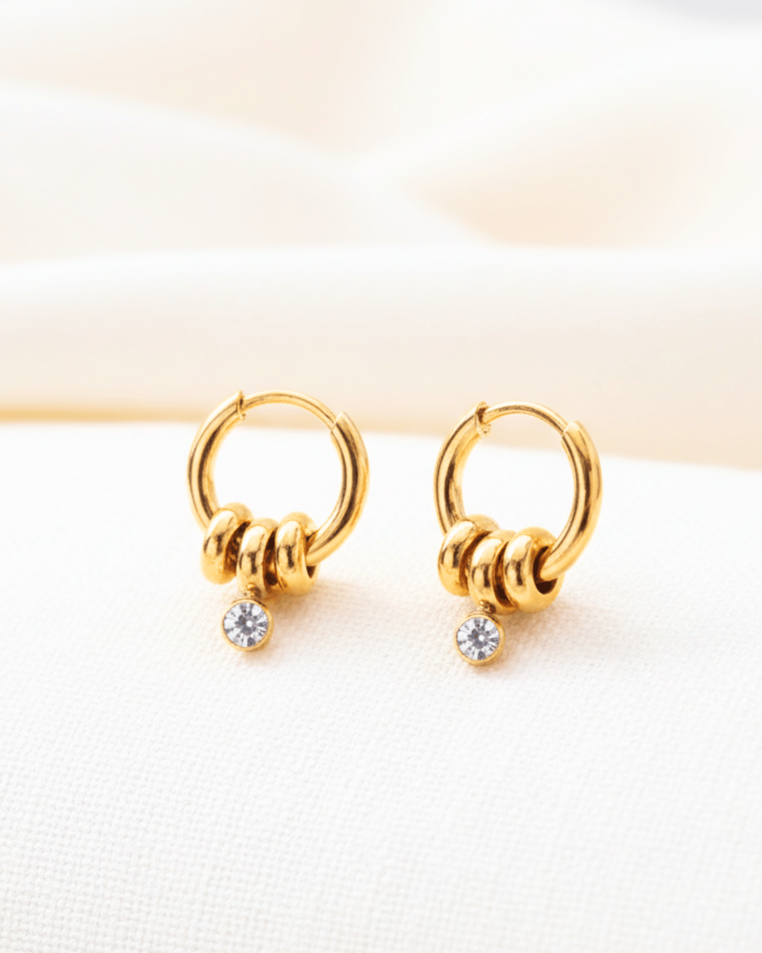 RTS. Zirconia Gold Hoop Geometric Earring is designed with a sleek geometric touch. Crafted from durable 304 stainless steel and finished with 18K real gold vacuum electroplating (PVD coated in furnace), this piece offers long-lasting shine and strength. It it’s perfect for everyday wear or special occasions. Handmade and handpacked in the USA by an all women oriented business. It offers hypoallergenic posts and it is completely waterproof & non-tarnish, making it perfect for everyday wear or special occasions. It is designed in a gold hoop with 3 geometric circle gold dangles. Handmade and handpacked in the USA by an all women oriented business.